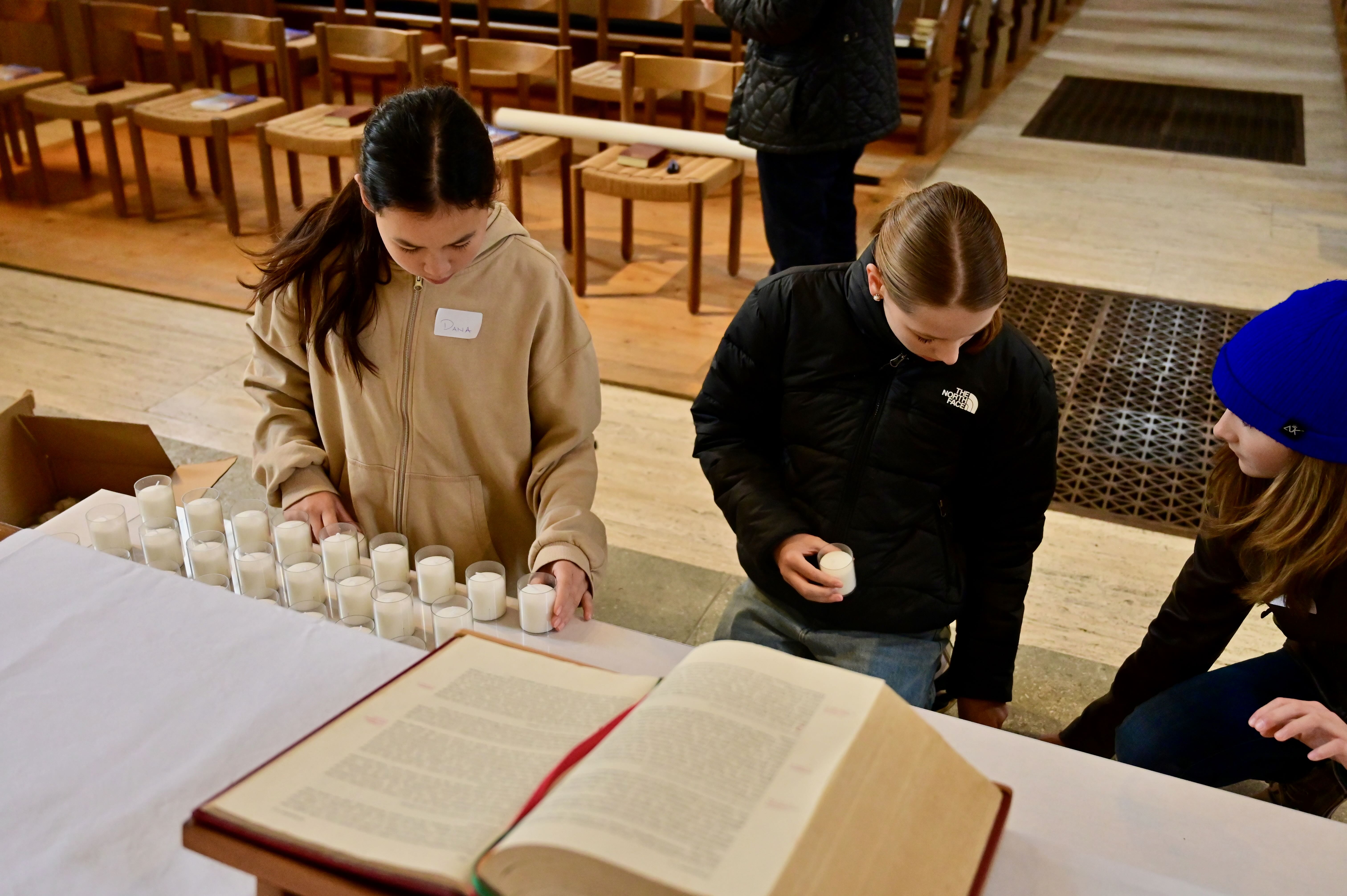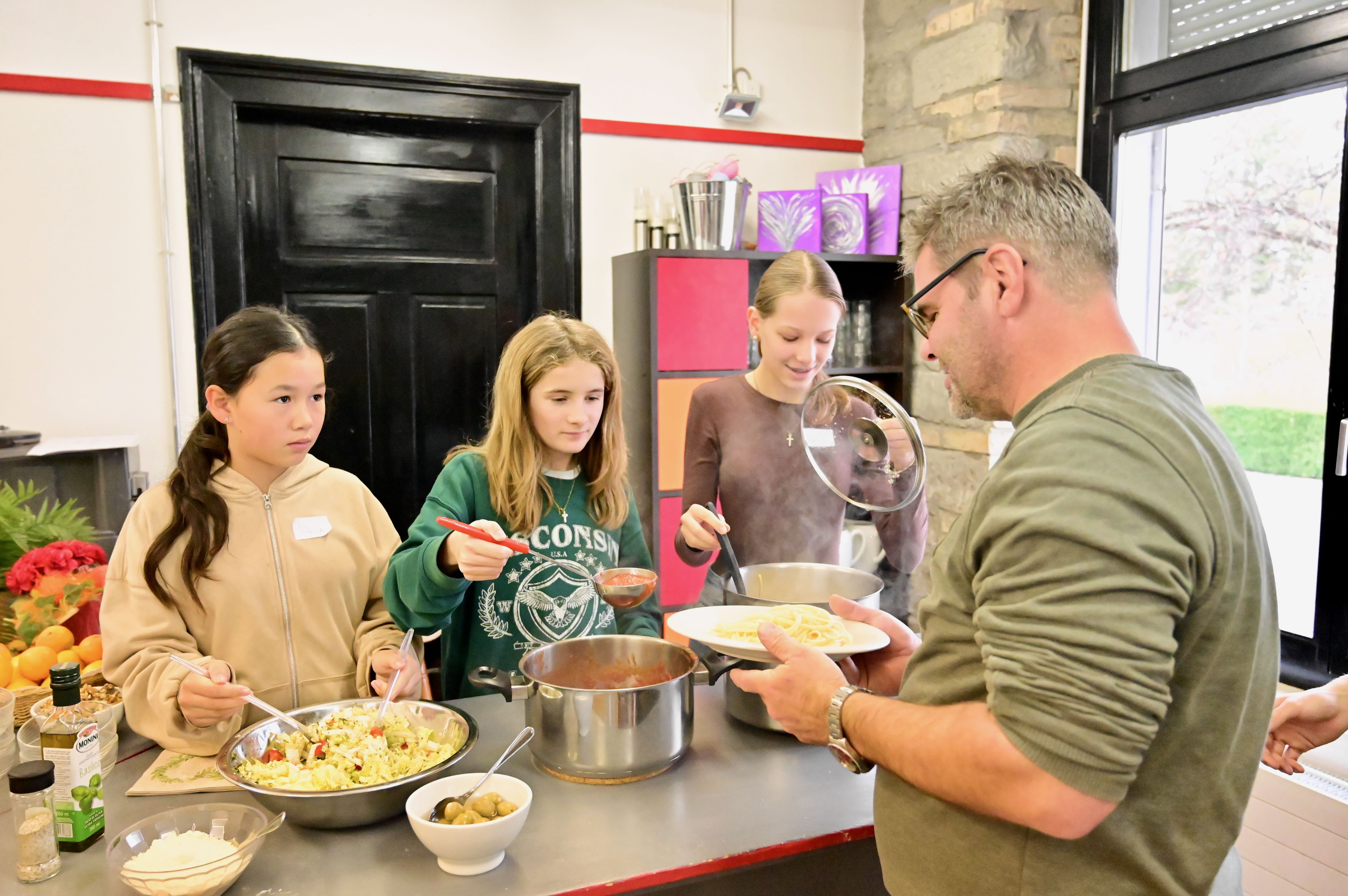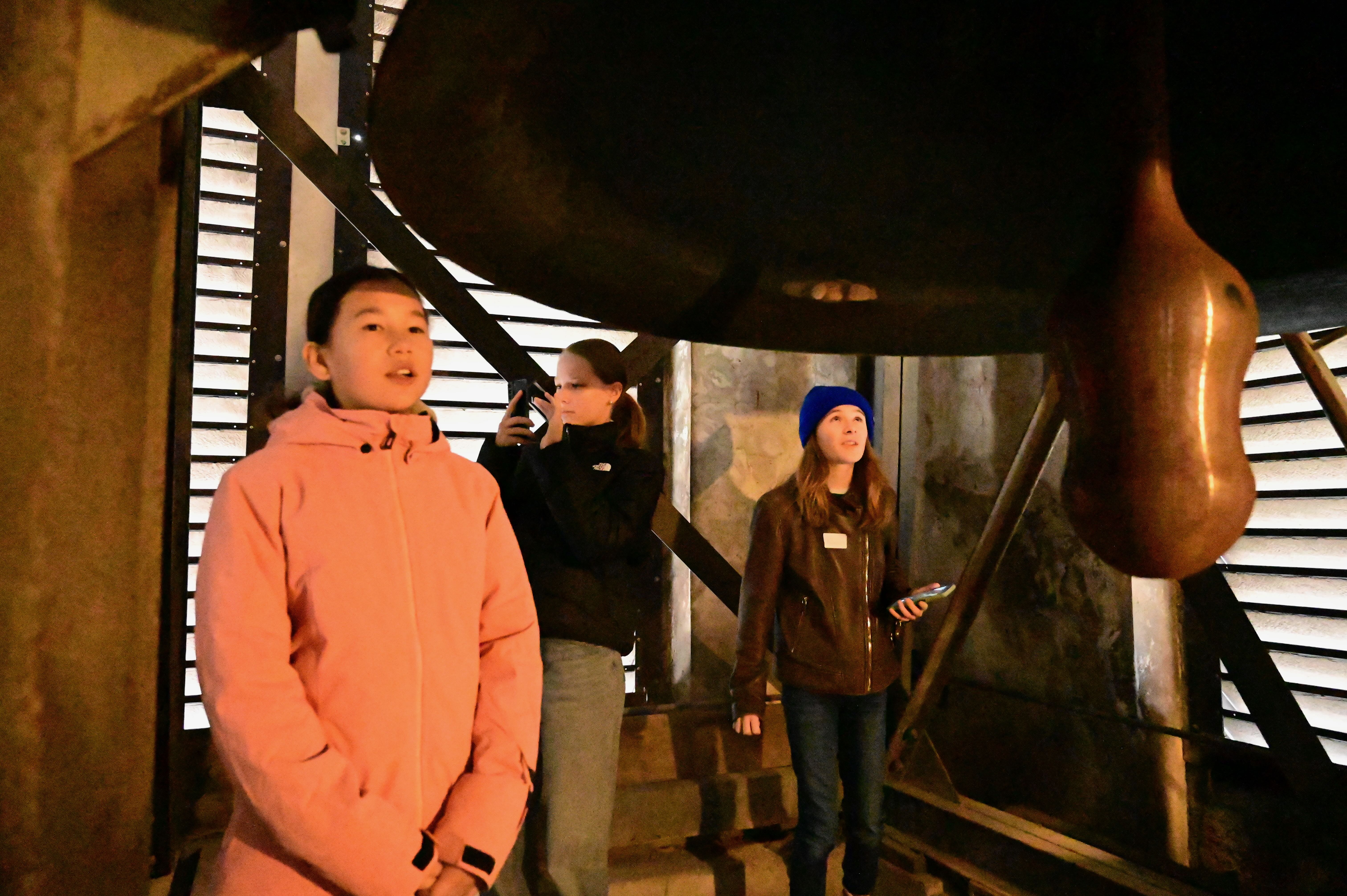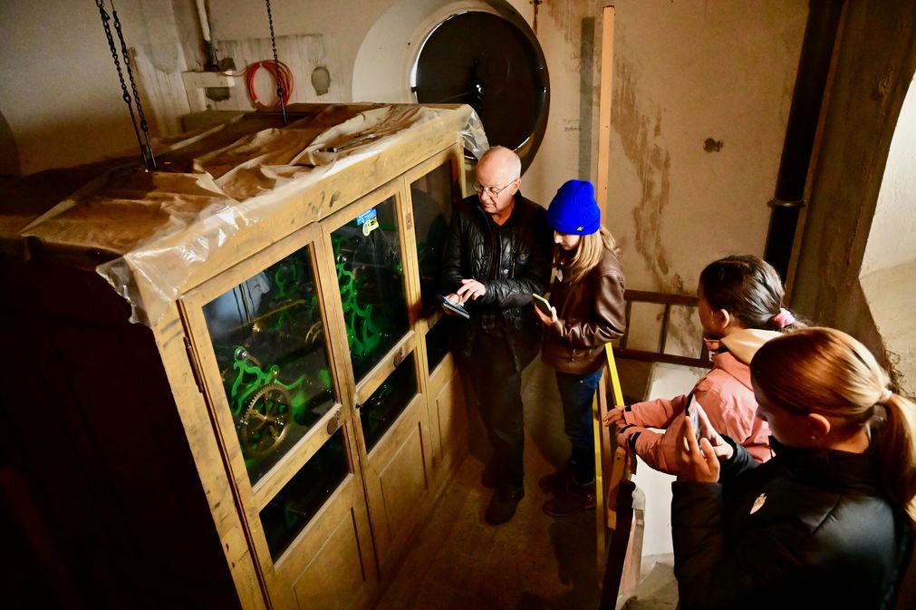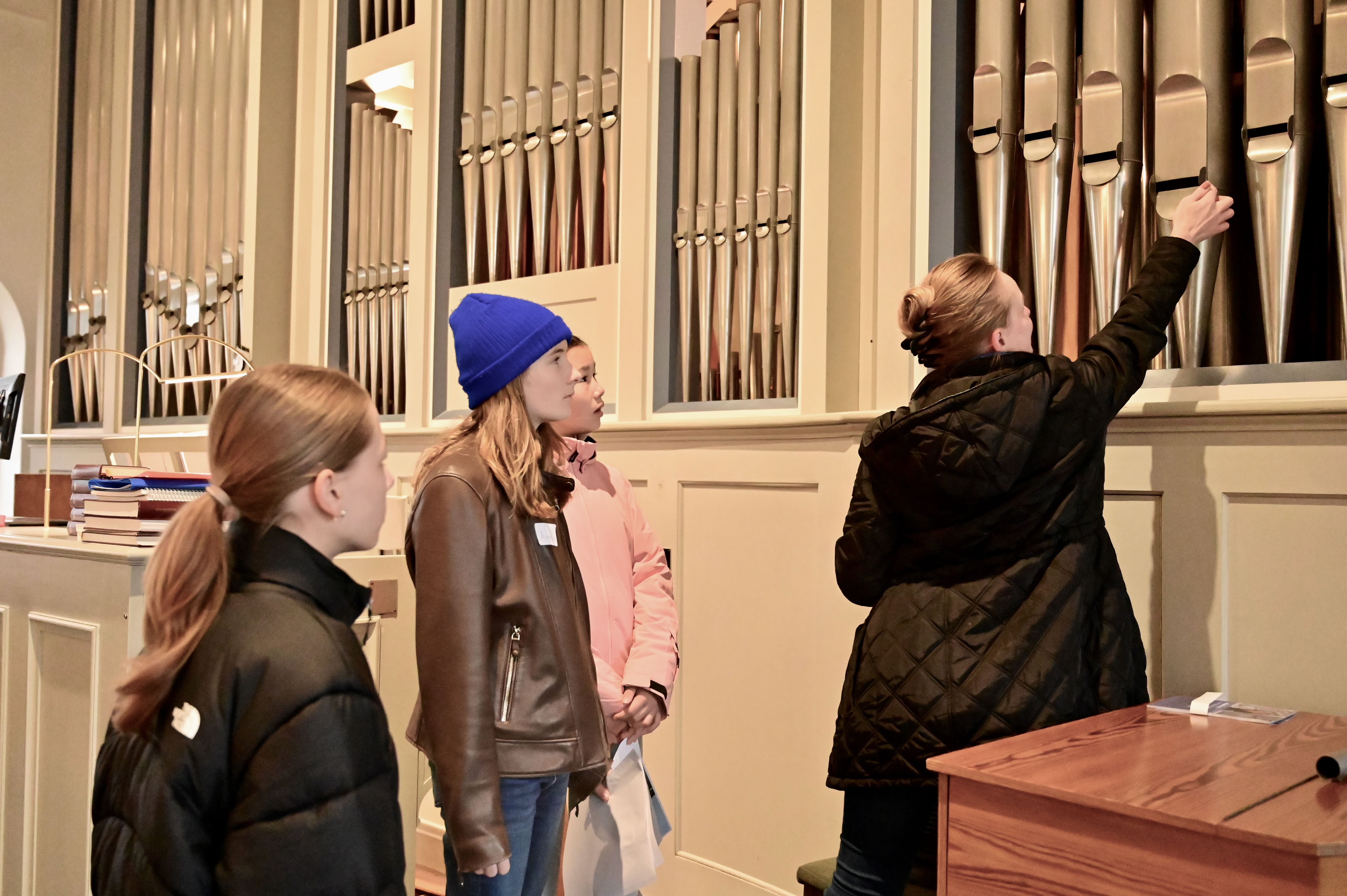 Nach einer lockeren Kennenlernrunde startet der Tag gleich mit einer besonderen Abschiedsfeier für einen langjährigen Mitarbeiter – eine erste Gelegenheit, Gemeinschaft und Zusammenhalt in der Kirchgemeinde hautnah zu erleben. Anschließend geht es auf einen spannenden Postenlauf quer über das Kirchengelände: Von der Abdankungshalle über die Orgel bis hinauf zum Kirchturm gibt es viel zu entdecken. Beeindruckt betrachten die Schülerinnen das historische Uhrwerk und stimmen sogar ein Duett an der Orgel an – ein Moment, der sicher in Erinnerung bleibt. Dann wird es praktisch: Gemeinsam stellen die Jugendlichen Kerzen für den Ewigkeitssonntag auf und hängen die Liednummern für den Gottesdienst auf. Nach all den neuen Eindrücken folgt eine Pause im Jugendhaus, wo zusammen Spaghetti gekocht wird.