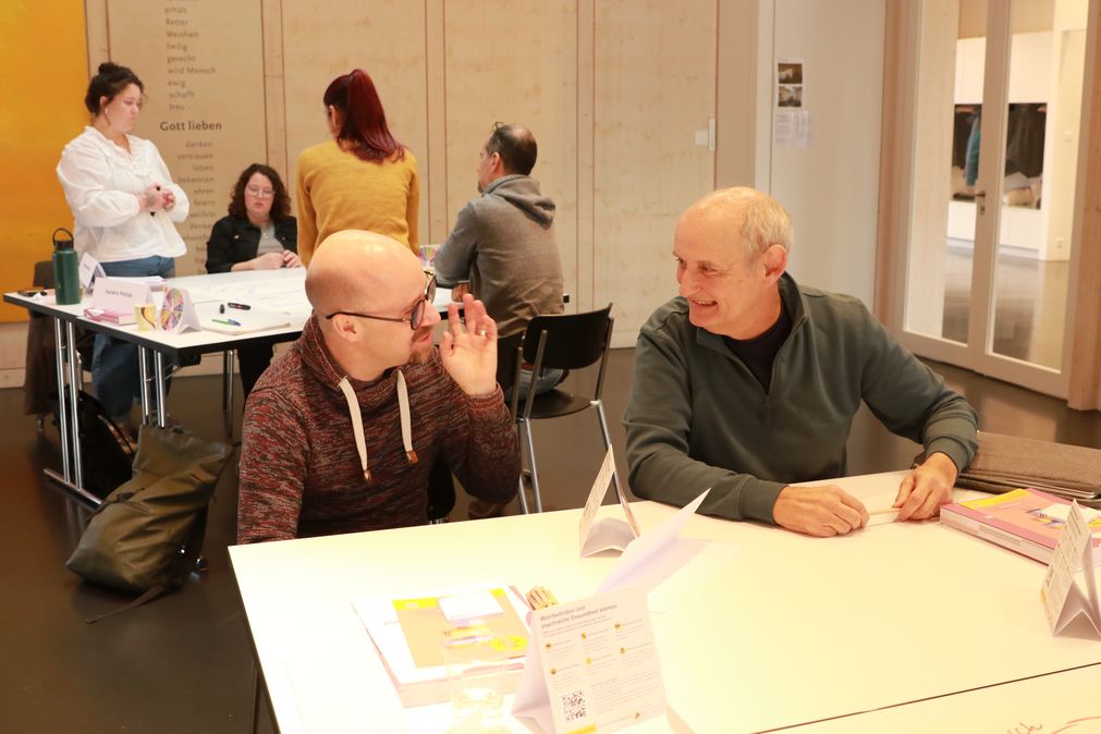 Sam Amman und Thomas Alder diskutieren über die Bedeutung der Jugendarbeit in den Kirchgemeinden im Hinblick auf die psychische Gesundheit. Bild: Claudia Koch