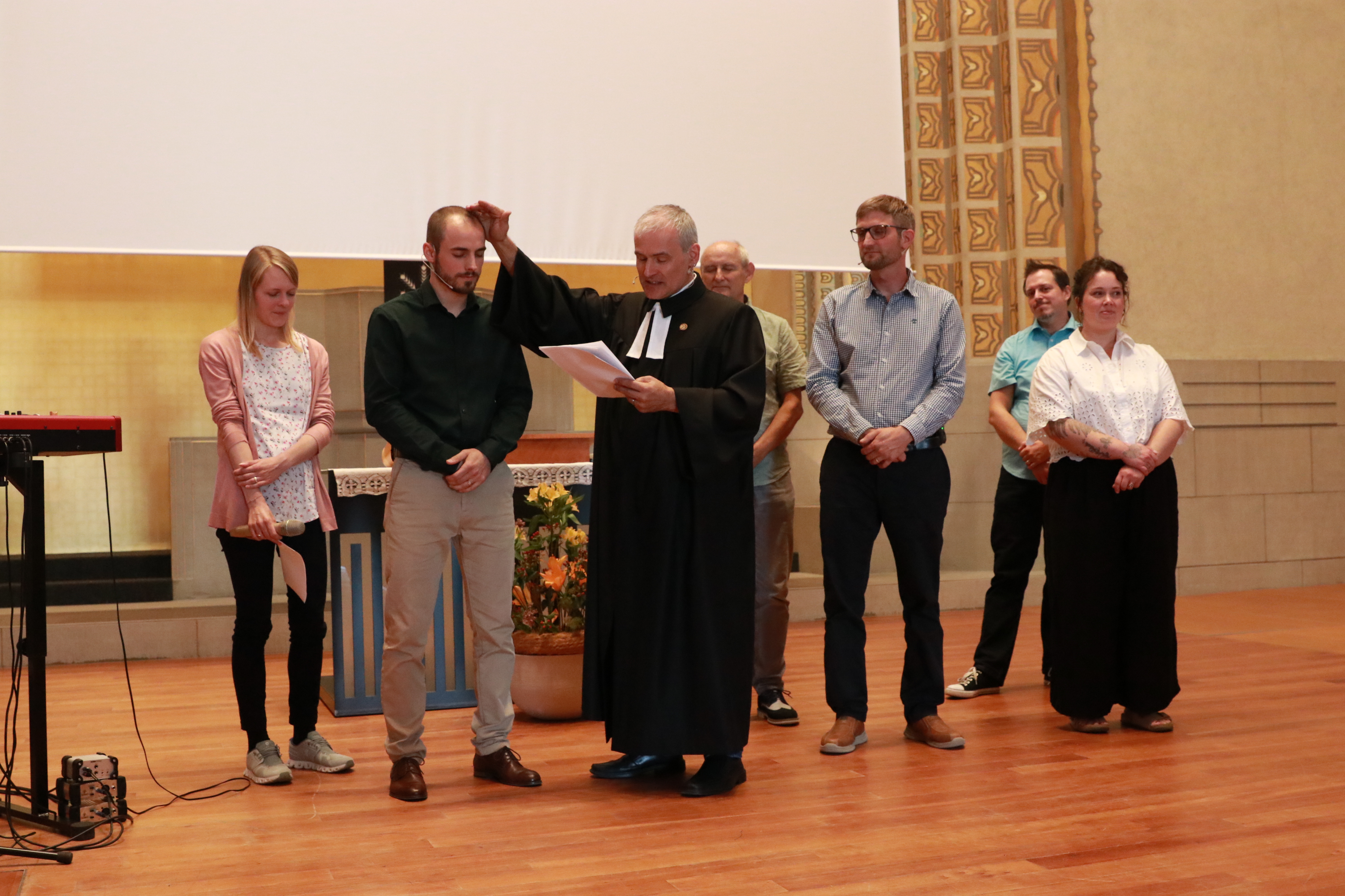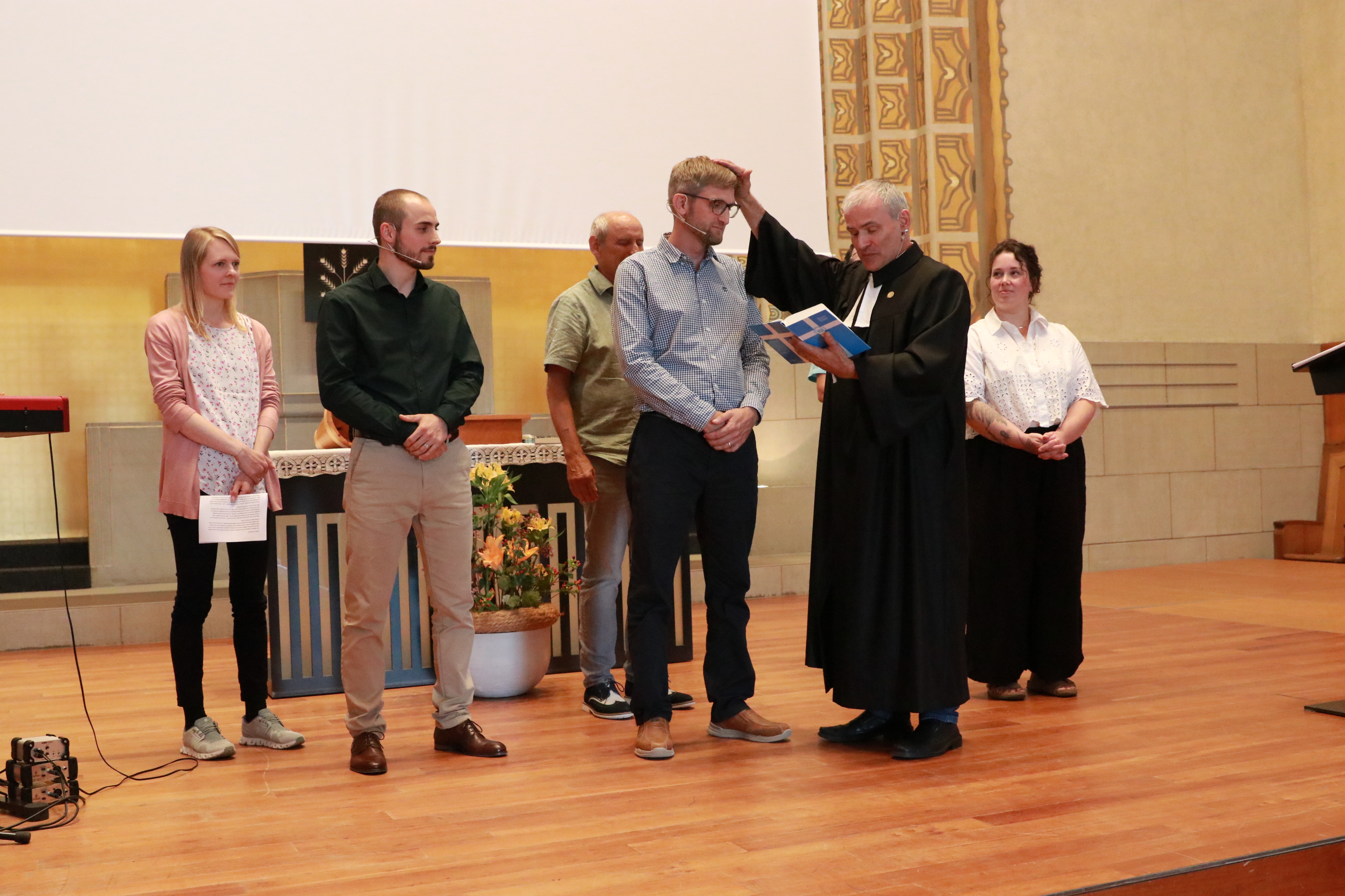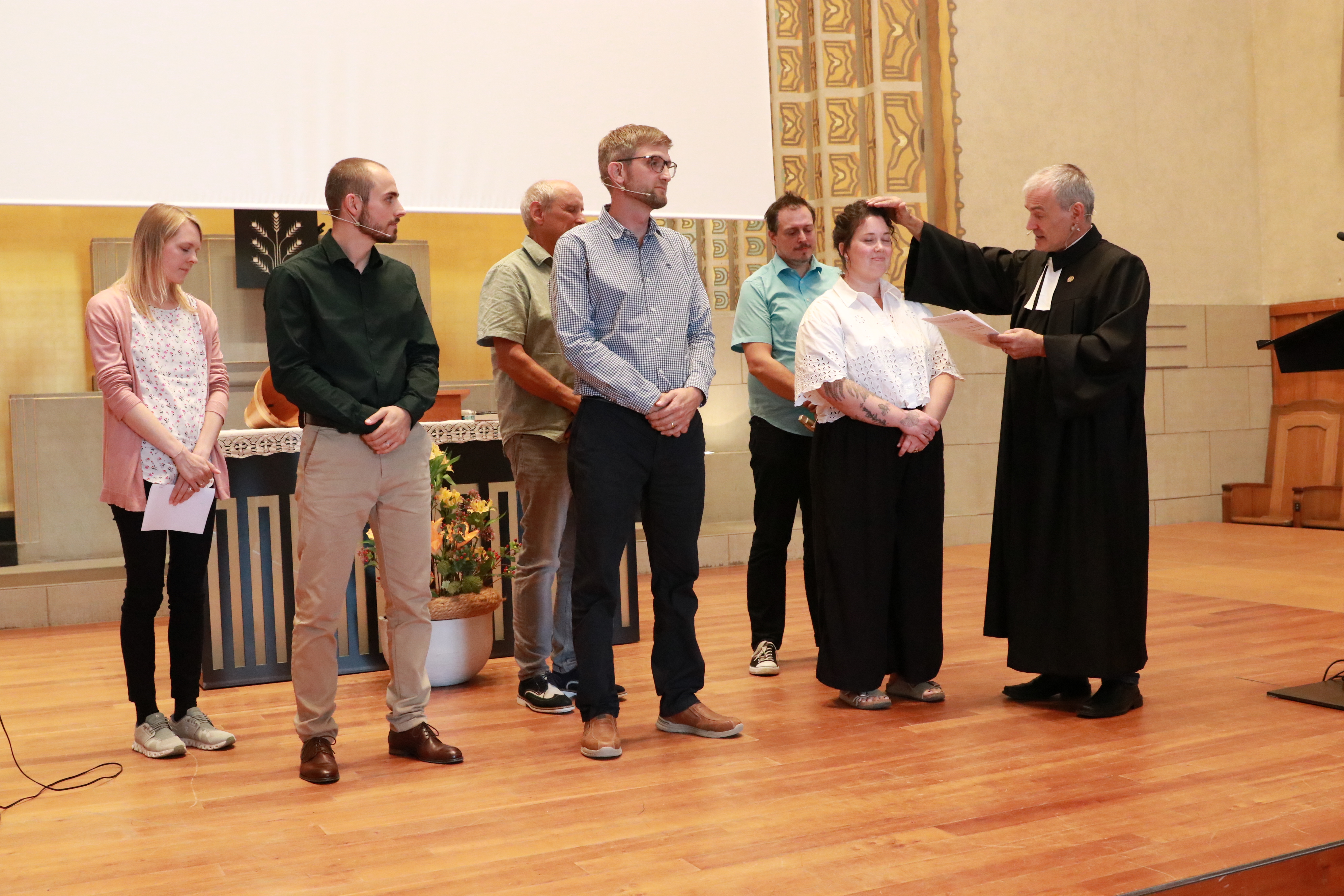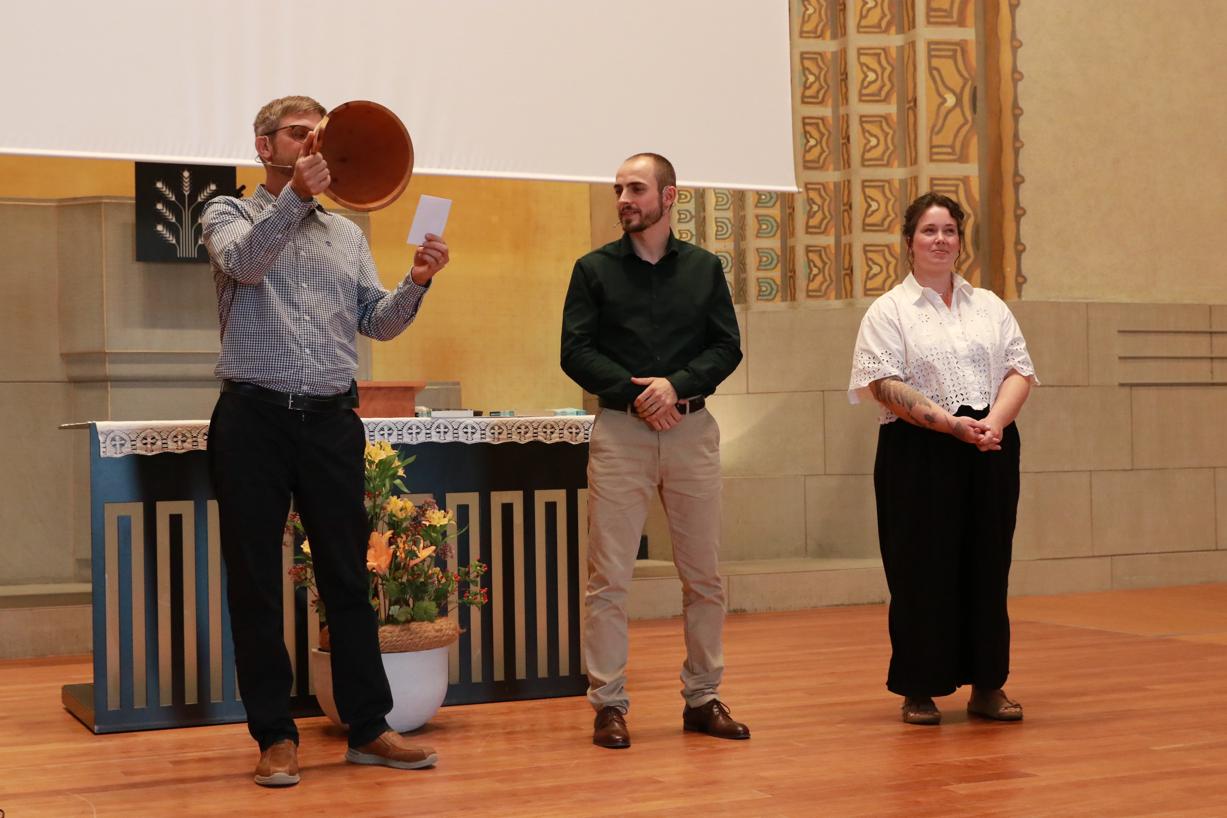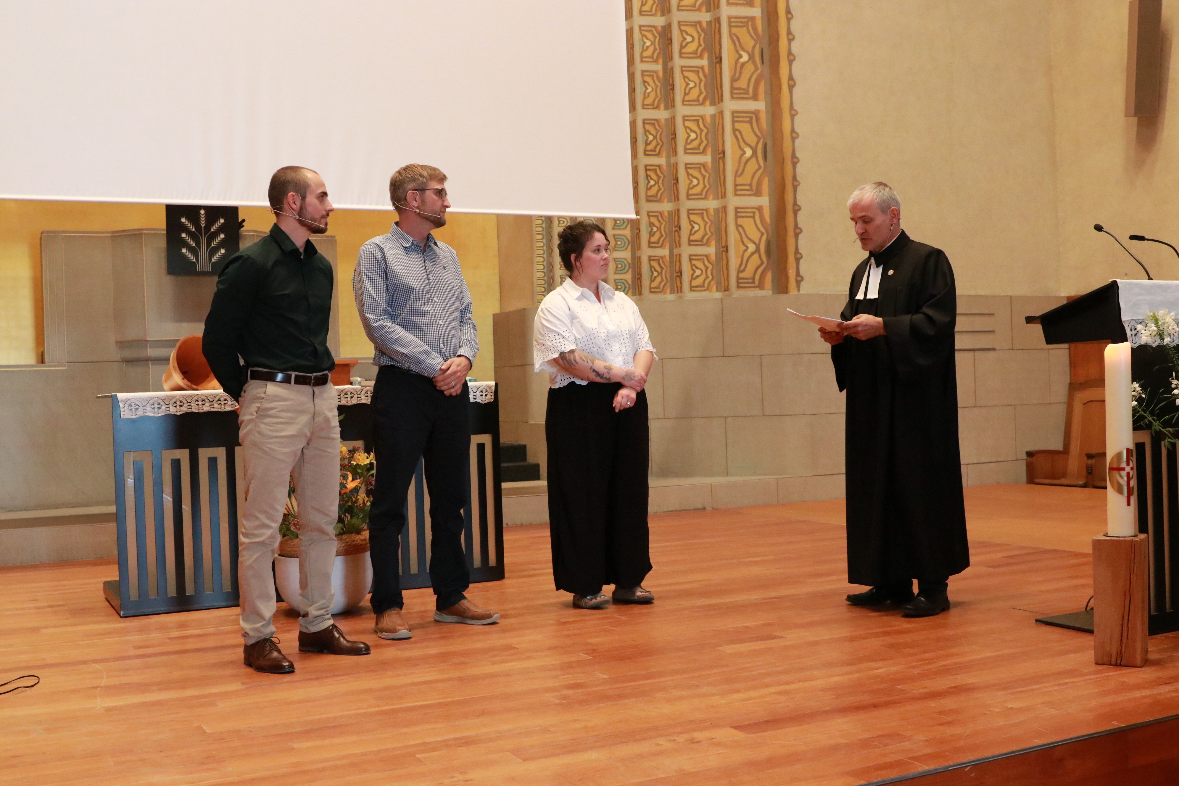 Kirchenrat Pfarrer Paul Wellauer dankte für die Bereitschaft, das Amt als Diakonin respektive Diakon zu übernehmen. Künftig werden sie Gottesdienste, Beerdigungen sowie Hochzeiten verantworten dürfen. Mit der Verpflichtung und der Ermächtigung sowie anschliessendem Segen durch Pfarrer Wellauer wurden Verena Bösch, Stefan Maag und Remo Rüegg ordiniert. Die Vertrauenspersonen sprachen Fürbitten. Am Schluss riefen die frisch Ordinierten mit einem Holztrichter der Gemeinde den Segen zu. Musikalisch wurde der Gottesdienst durch die Allianz Band Hinterthurgau mitgetragen. Zum anschliessenden ebenso reichhaltigen Apéro lud die Kirchenpräsidentin von Romanshorn-Salmsach Jeannette Tobler, herzlich ein.