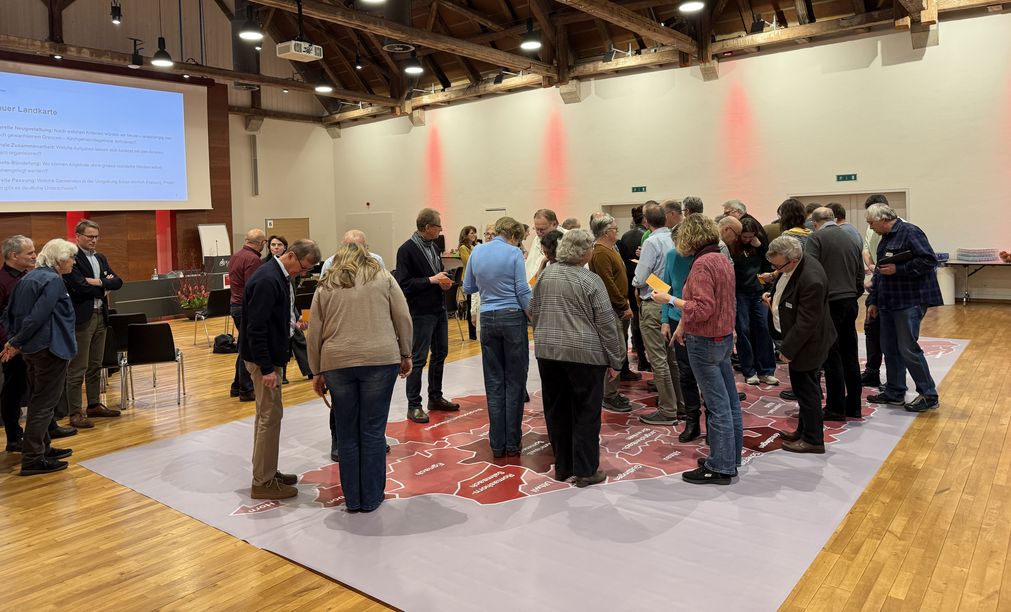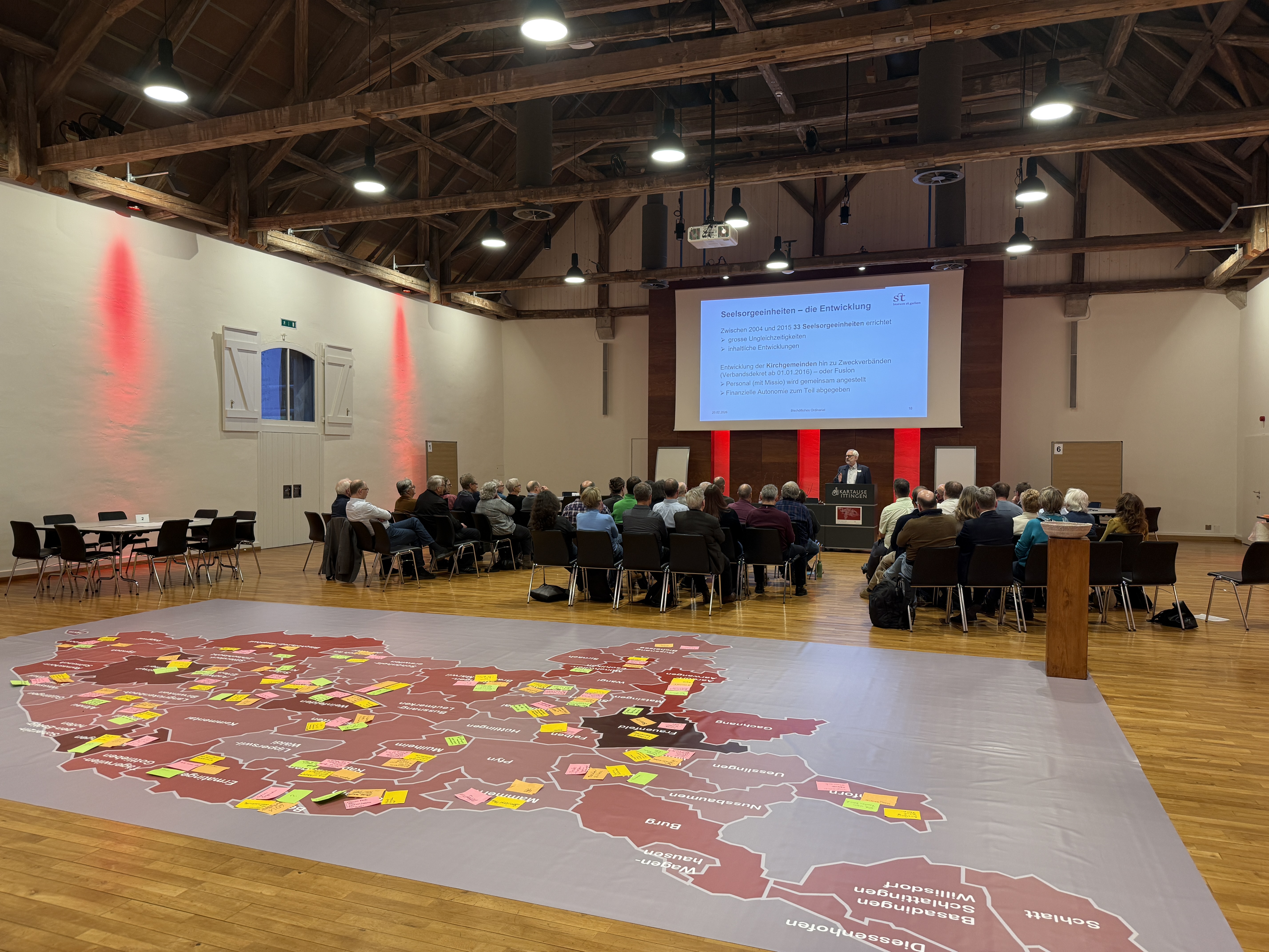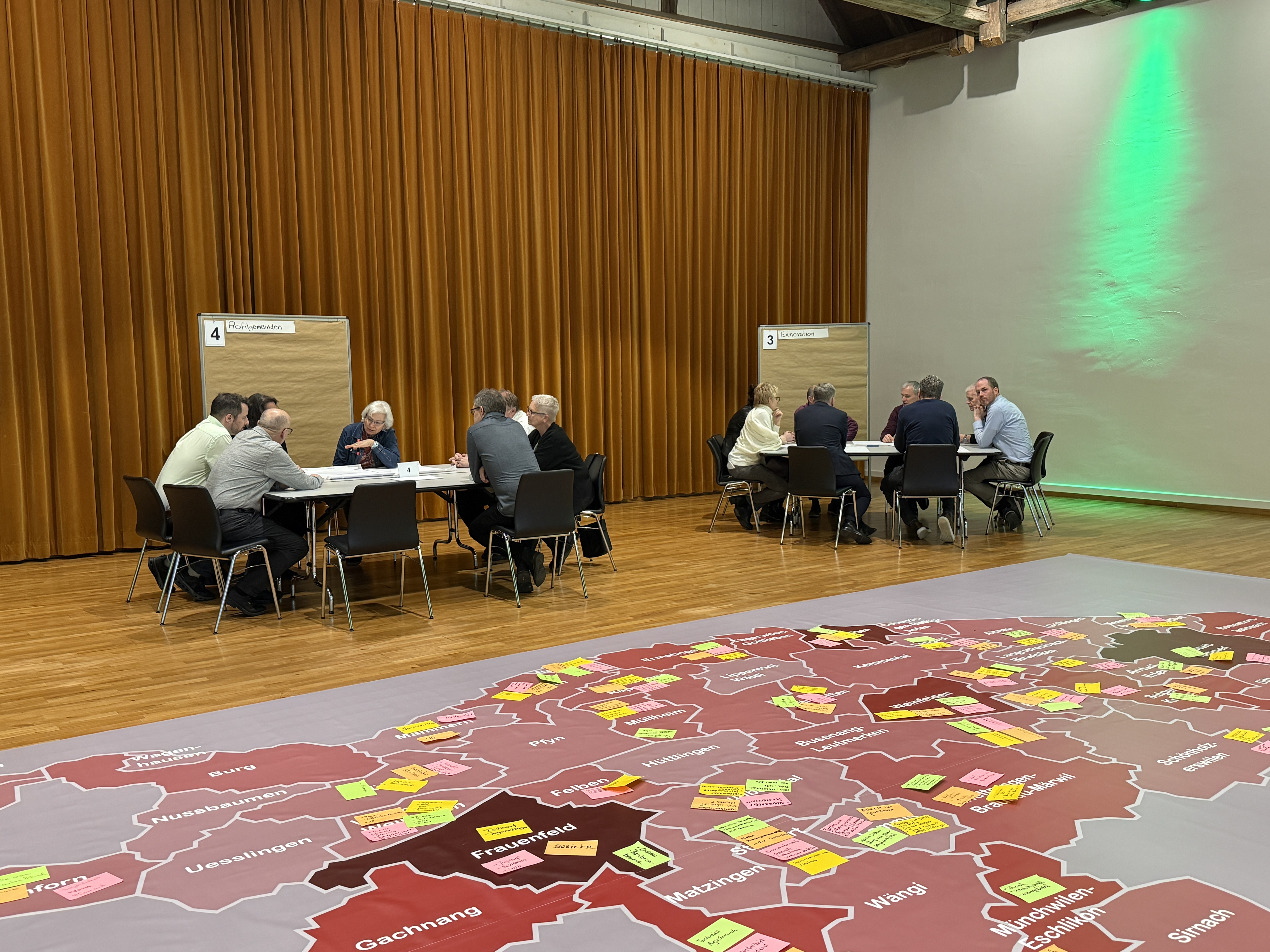 Die Teilnehmenden wurden am Freitag nach einer herzlichen Begrüssung von Kirchenratspräsidentin Christina Aus der Au und von Daniel Frischknecht, dem Mitarbeiter der Fachstelle Gemeindeentwicklung, gleich wieder in den weiten Thurgau hinausgeschickt. Da lag nämlich eine riesige Thurgauer Karte auf dem Boden, damit sich die Präsidentinnen und Präsidenten auf das Gebiet ihrer Kirchgemeinden stellen und nach links und rechts schauen konnten. Wie würden wir heute die Grenzen ziehen? Wo könnten wir mit den direkten Nachbarn, ganz ohne grosse Strukturänderungen, zusammenarbeiten - und wo tun wir es schon? Mit Post-its wurden Wünsche und Zukunftspläne markiert, und das machte die Karte schon richtig lebendig und bunt.