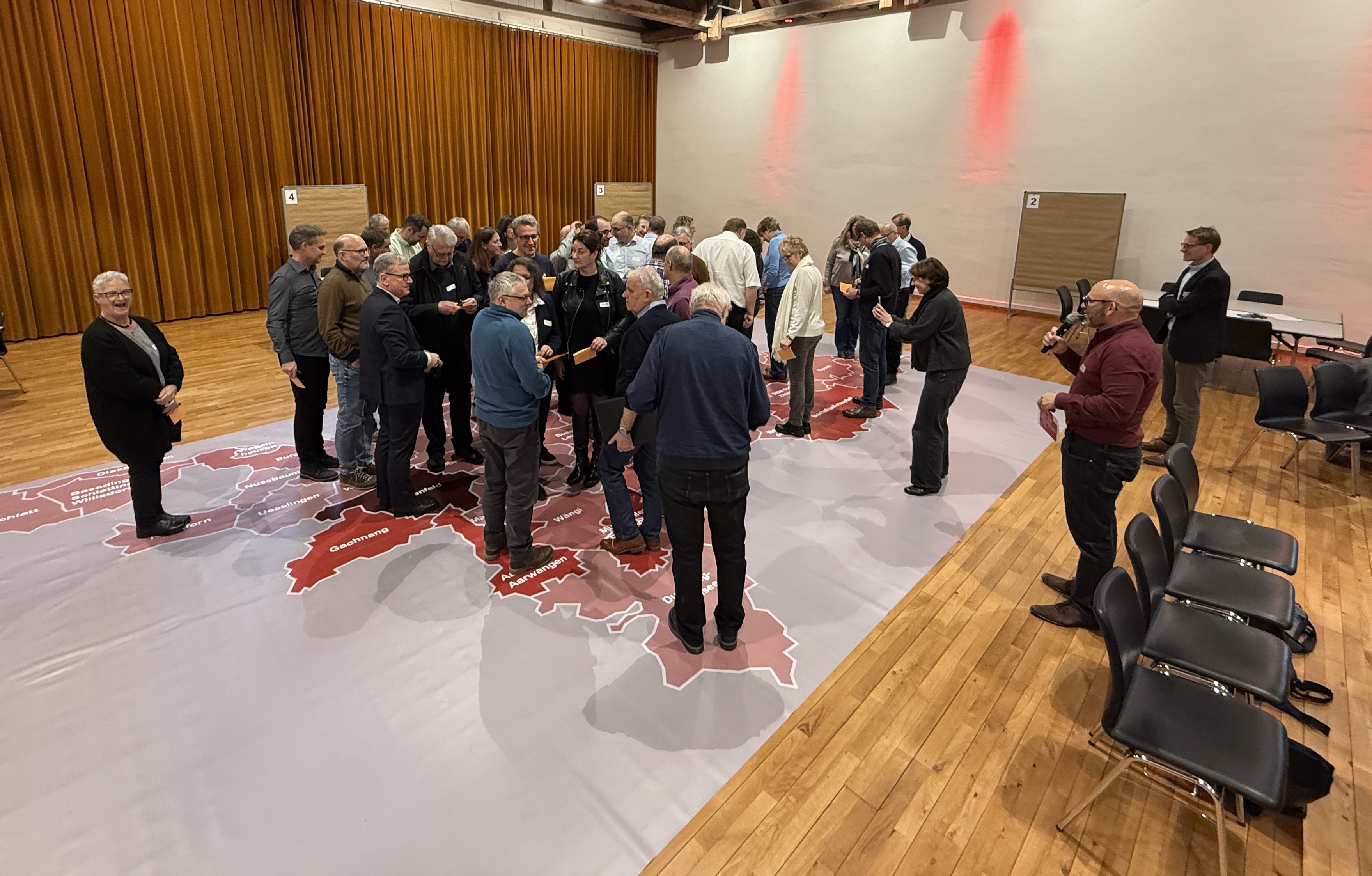 An der Präsidienkonferenz wurden die Teilnehmenden aufgefordert, auf ihr Gemeindegebiet auf der Thurgauer Landkarte zu stehen. Bild: Hanna Röthlisberger