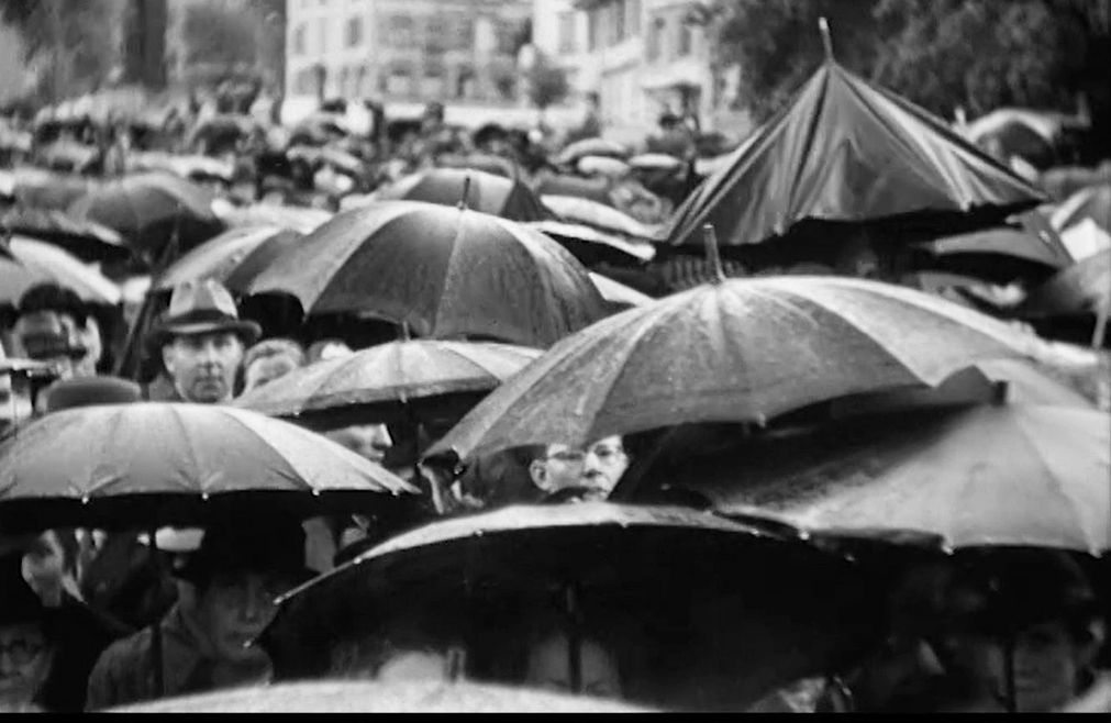 Ein Meer von Regenschirmen: 7‘000 Menschen nahmen am 31. August 1941 am Protestantischen Volkstag mit Bundesrat Karl Kobelt in Altstätten im St. Galler Rheintal teil. Bild: Aus Schweizer Wochenschau